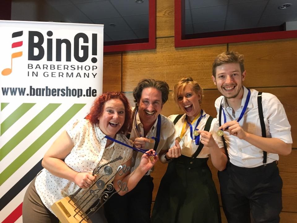 First held in Goch in 1995, this BinG! competition has been taken along to each new “home” of Harmony College over the years and has become a permanent fixture in the BinG! calendar. In honor of the origins of Harmony College, which was first held in 1991 as a choir workshop in Coesfeld, the annual competition was named the “Coesfeld Cup” in 1998. It is thus the oldest barbershop competition in Germany.